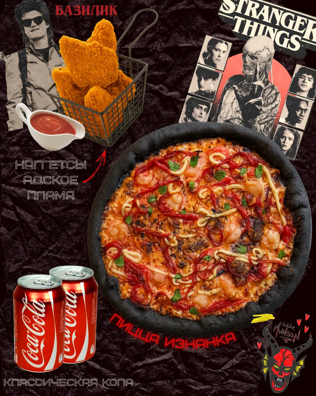Пикантный томатный соус, растянутая моцарелла, сочные креветки и кальмар, яркая красная чука, чесночный аромат и немного зелени — будто свет в глубине тьмы.